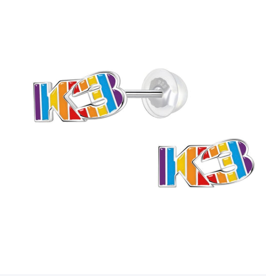 Zilveren oorstekers k3 collectie, k3 logo in regenboogkleuren.
